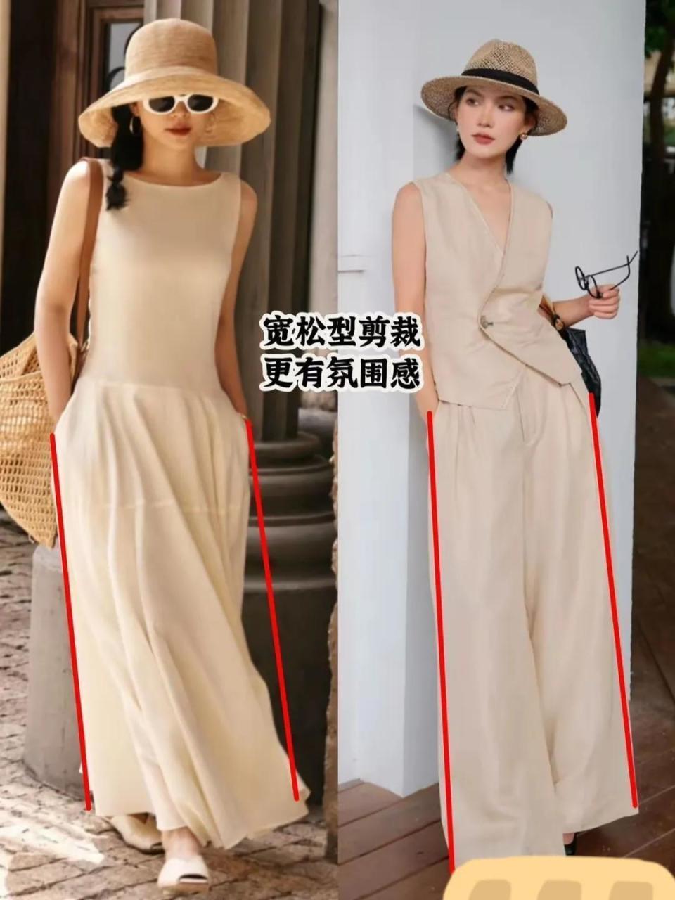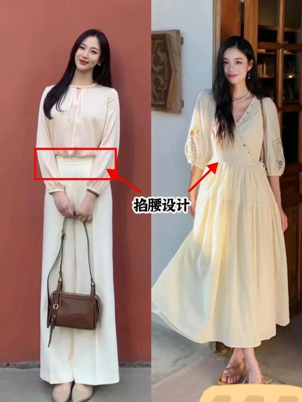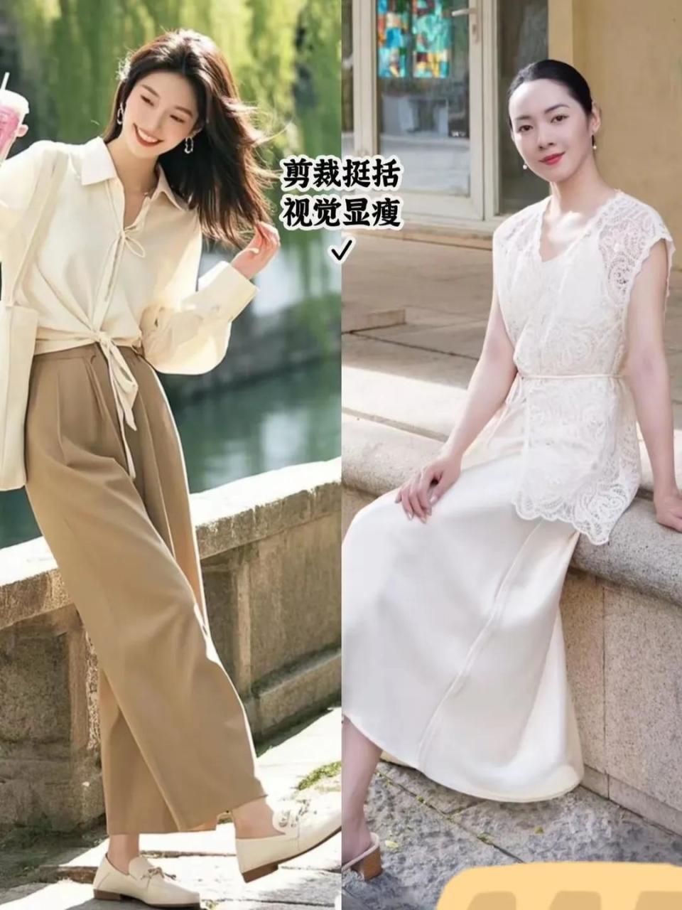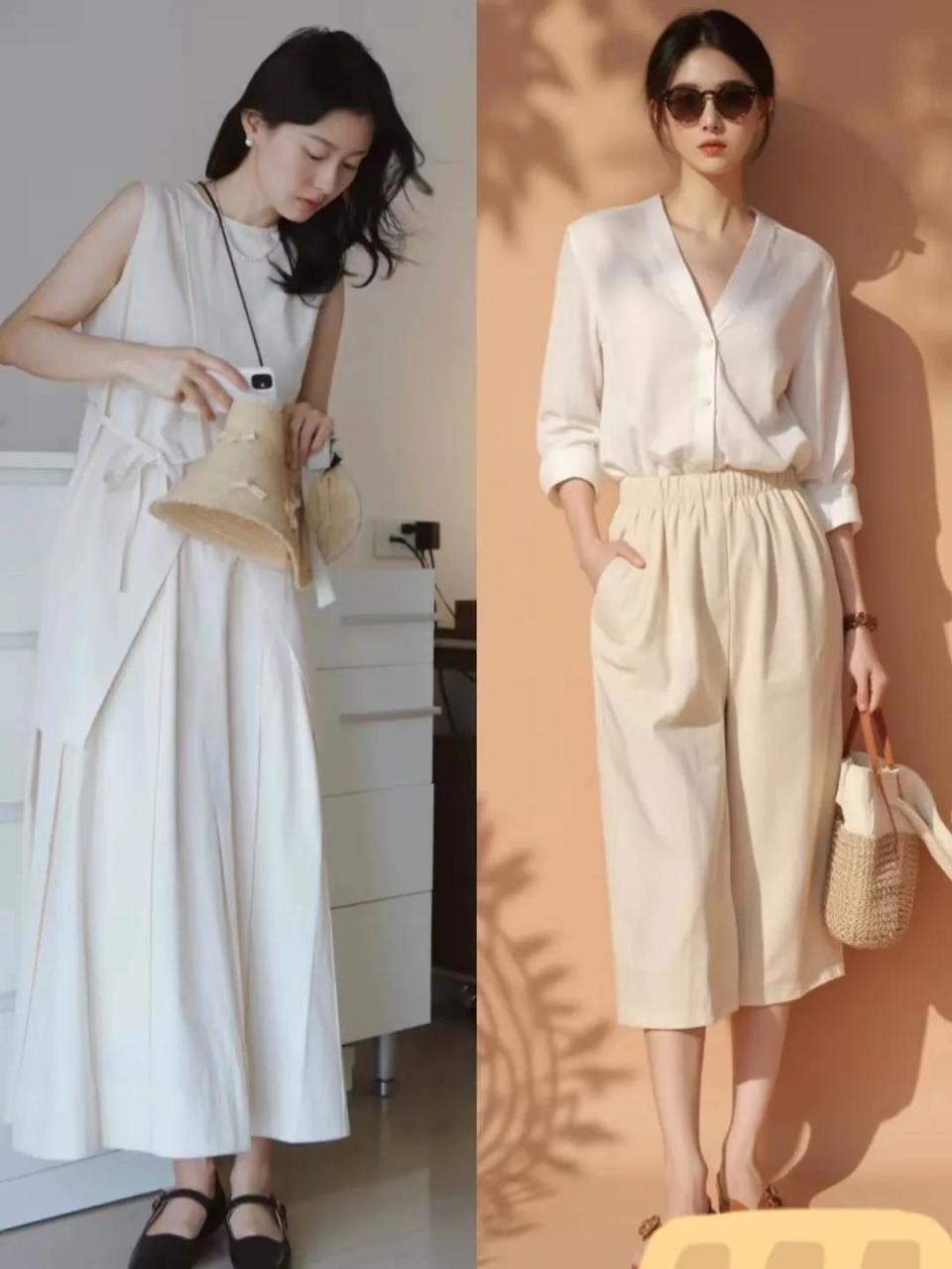 例如下面用一件杏色的衬衫上衣搭配白色的阔腿裤,这样的顺色搭配能很好的提升腰线,而且衣服色彩也修饰肤色。