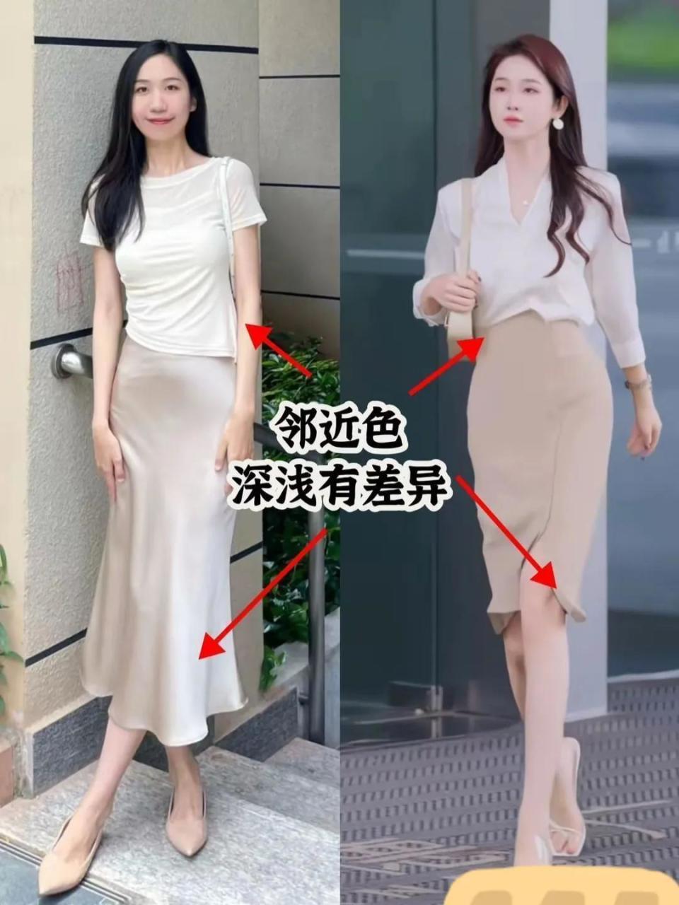 还可以选择近色搭配,简单的理解,这是你的上衣和下半身的裙子,色彩深浅有一定的差异,但是不会太大